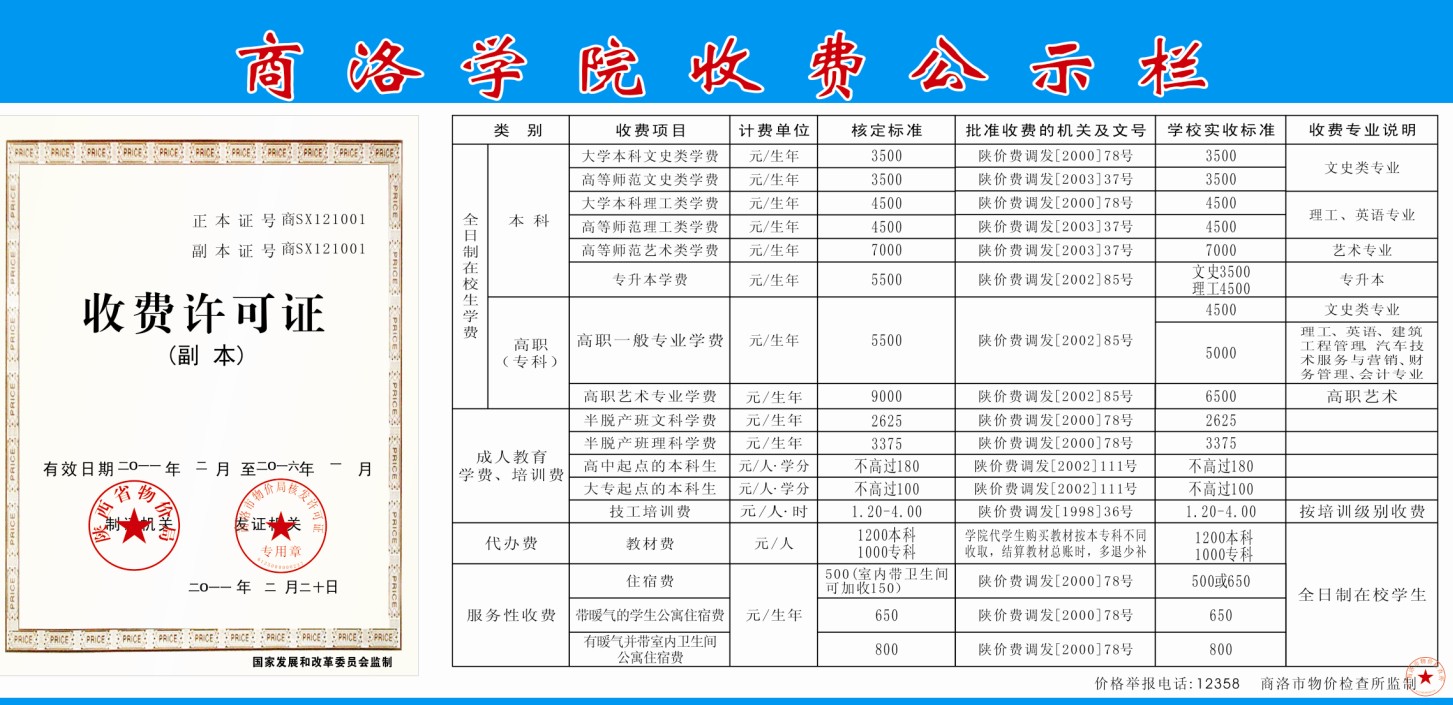 商洛学院收费项目公示牌